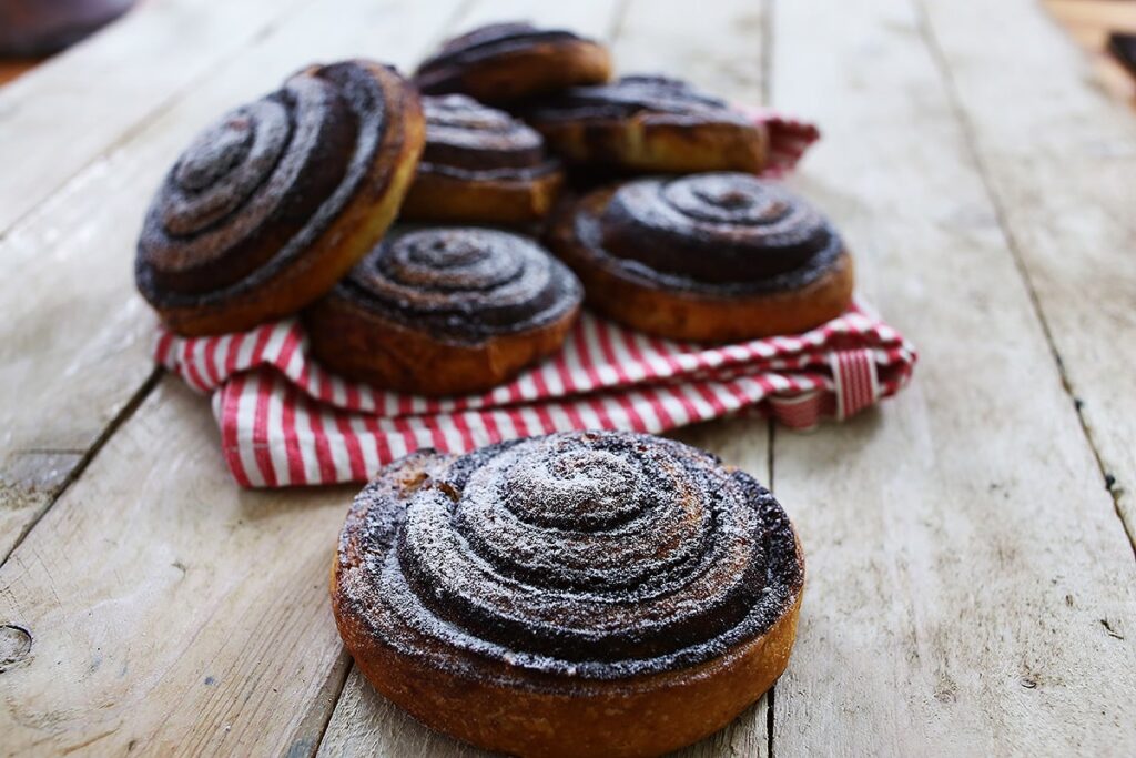A vajat közepesn keményre hűtjük és  két sütőpapír között 1/2 cm vastagságú tégalalpot nyújtunk belőle. Lehűtjük. A tejet langyosra melegítjük. Hozzáadjuk az 50 g cukor felét és felfuttatjuk benne az élesztőt (belemorzsoljuk és 10 percre félretesszük). A lisztet összekeverjük a maradék cukorral és a sóval. Beleöntjük a felfutott élesztőt és simára dagasztjuk. A tésztából golyót